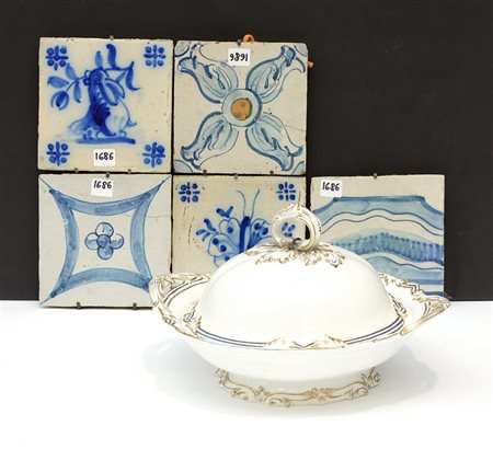 Lotto composto da una zuppiera con coperchio e cinque piastrelle in ceramica policroma (difetti)