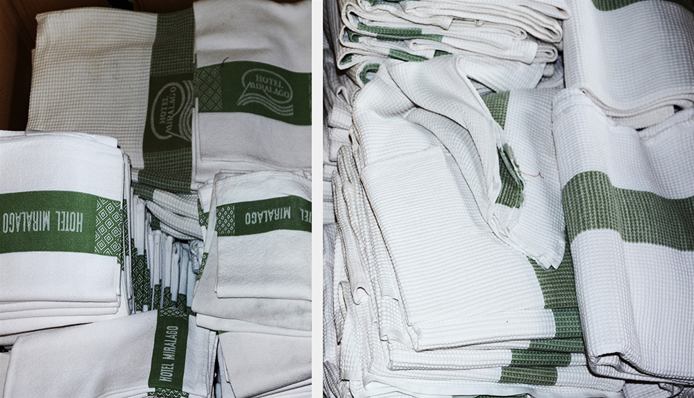 Lotto composto da quattro scatoloni contenenti vari asciugamani di cui alcuni marcati "Hotel Miralago" (difetti)