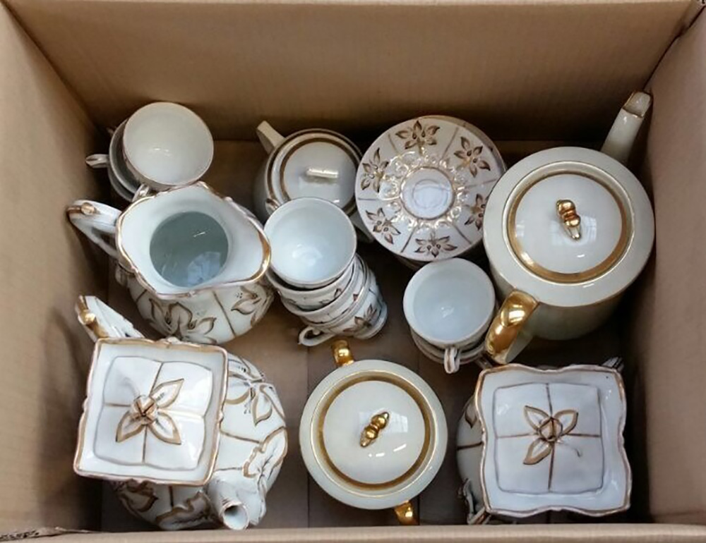 Cartone contenente parti di servizi da tè e caffè in porcellana con decorazioni in oro (difetti)