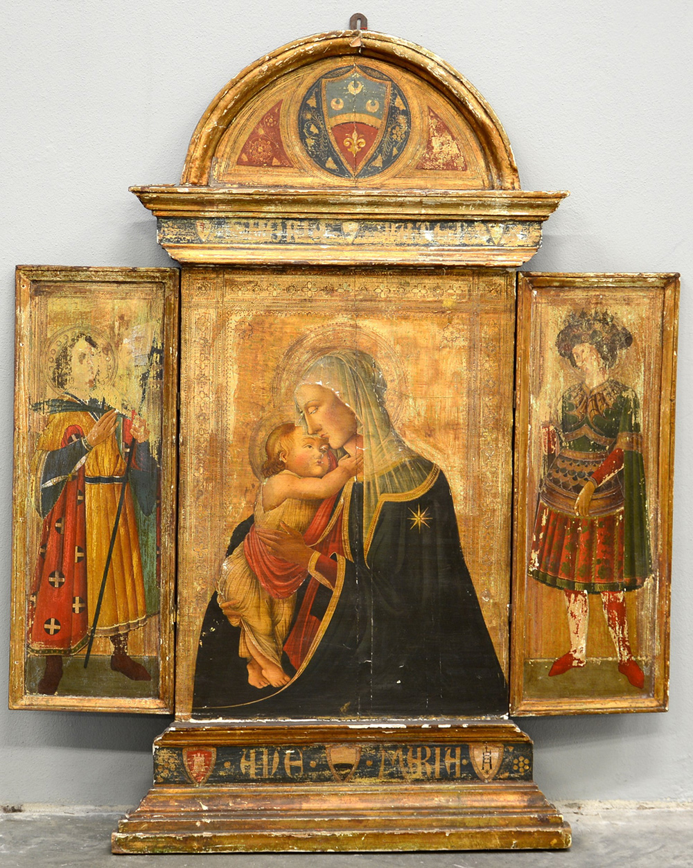 Copia di pala d'altare centinata dipinta su tavola, raffigurante la Madonna con Bambino e due Santi sugli sportelli, inizio secolo XX (aperta cm 100x120) (difetti)