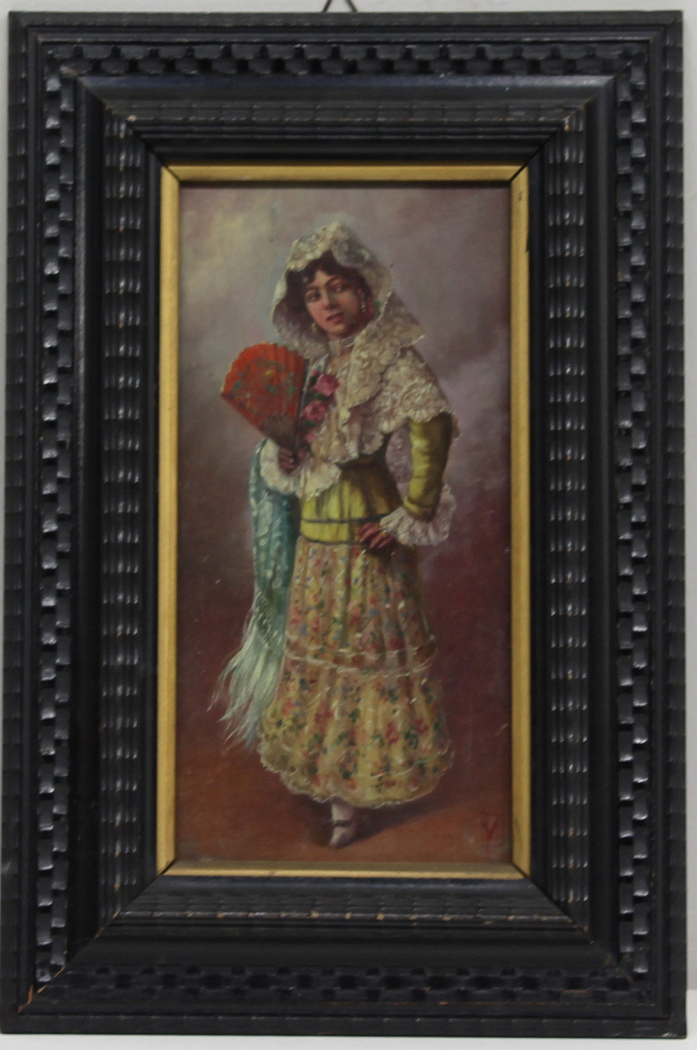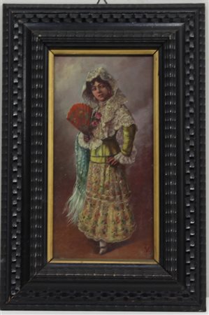 Artista di fine secolo XIX, "Ritratto femminile con ventaglio" olio su tavola (cm 27x13,5) in cornice ebanizzata (lievi difetti)