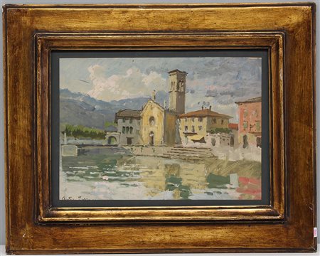 "Paesaggio con chiesa" olio su cartone (cm 25x35) firmato in basso a sinistra, in cornice (lievi difetti)