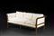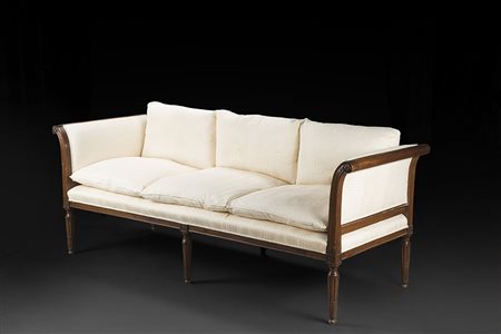 Divano da centro a tre posti in noce con braccioli e montanti sagomati...