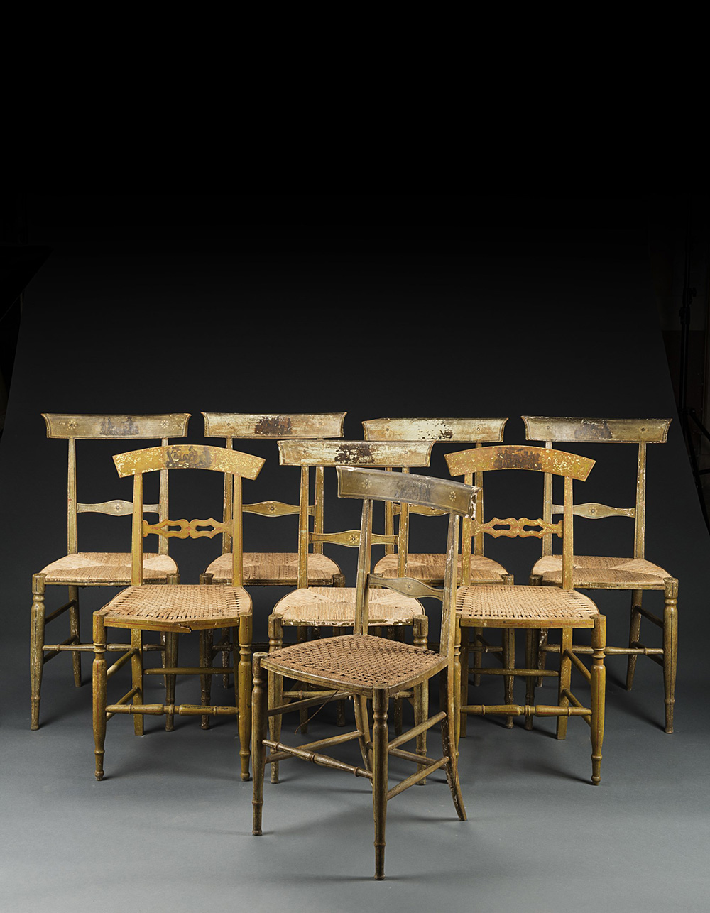 Gruppo di otto sedie in legno laccato e decorato in arte povera e a fiori. Gambe tornite riunite da traversa. Sec. XIX (difetti e lievi differenze)