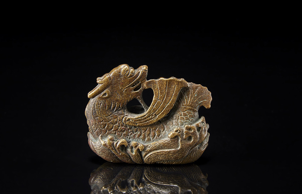 Scultura in bronzo raffigurante un kirin tra onde (cm 7,5x5,5) Giappone, sec. XX