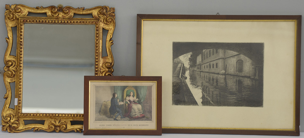 Lotto composto da una specchierina in legno dorato e due stampe di diversa epoca. In cornici (difetti)