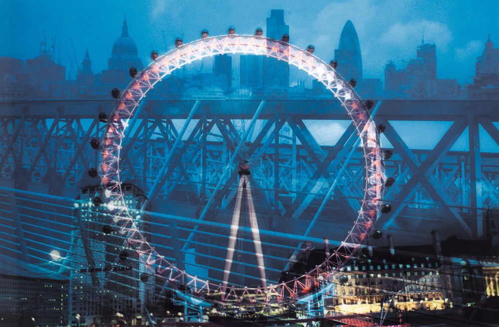 DAVIDE BRAMANTE Siracusa 07/11/1970 London (ruota + ponte), 2007 fotografia a colori realizzata con la tecnica delle doppie e più esposizioni non in digitale, montate su D-bond e plexiglass cm. 100x153, edizione 3/5, firma su etichetta dell'artista al retro, certificato d'autenticità della Galleria Contemporanea (PE) allegato.