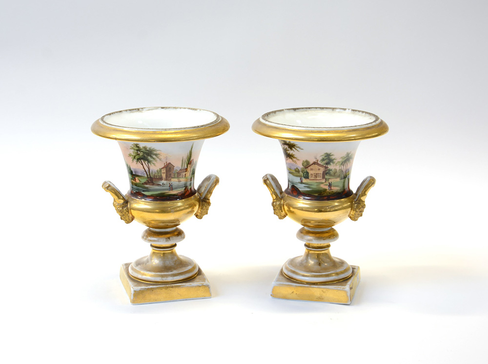 Manifattura del sec. XIX. Coppia di vasi biansati in porcellana decorata a paesaggi (h cm 24) (difetti)