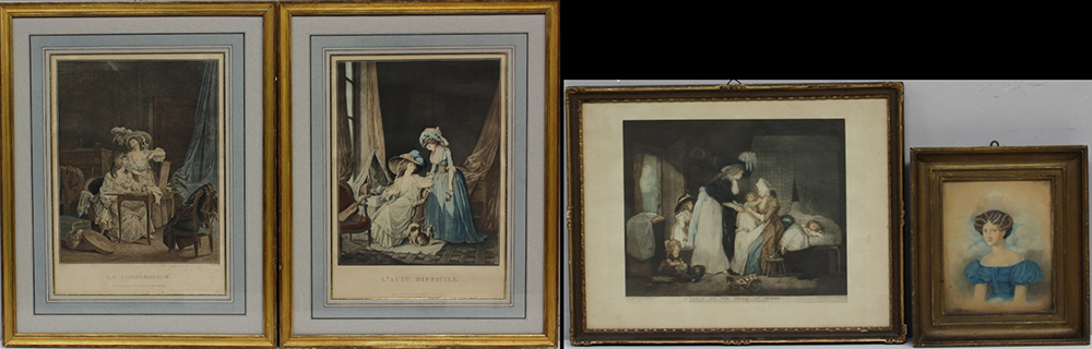 Lotto composto da quattro incisioni a colori di soggetto e dimensioni differenti (difetti). In cornici disomogenee.