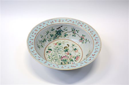 Manifattura Cina, grande ciotola in porcellana decorata a fiori su fondo verde, sec. XX (d cm 40) (lievi difetti)
