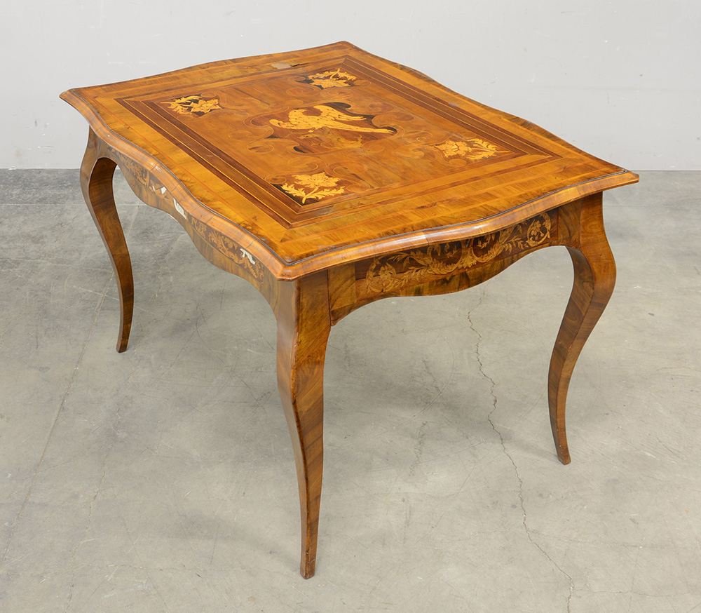 Tavolo rettangolare con gambe mosse, piano intarsiato con rapace e...