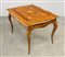 Tavolo rettangolare con gambe mosse, piano intarsiato con rapace e crisantemi, fascia decorata con intarsi in legno e avorio a foglie e figure. Sec. XIX (cm 116x74x85) (mancanze e restauri)