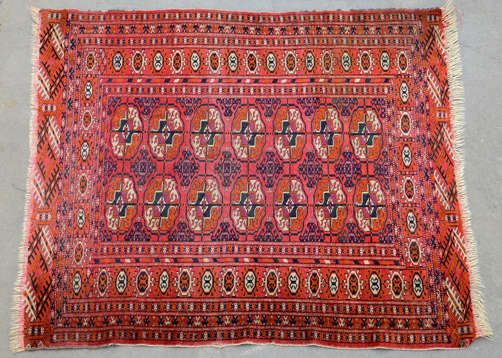 [Tappeti] Tappeto Bohukara, Turkestan occidentale , secolo XX. Disegno a Gul su fondo rosso (cm 103x93) (difetti)
