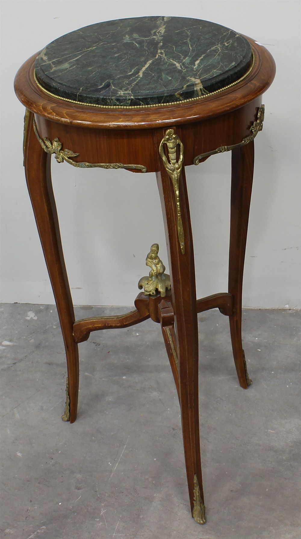 Portavaso con gambe sagomate riunite da traverse e decorato da fregi in metallo dorati. Piano in marmo (d cm 28, h cm 80)