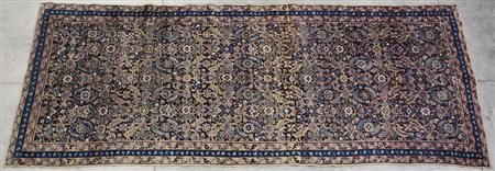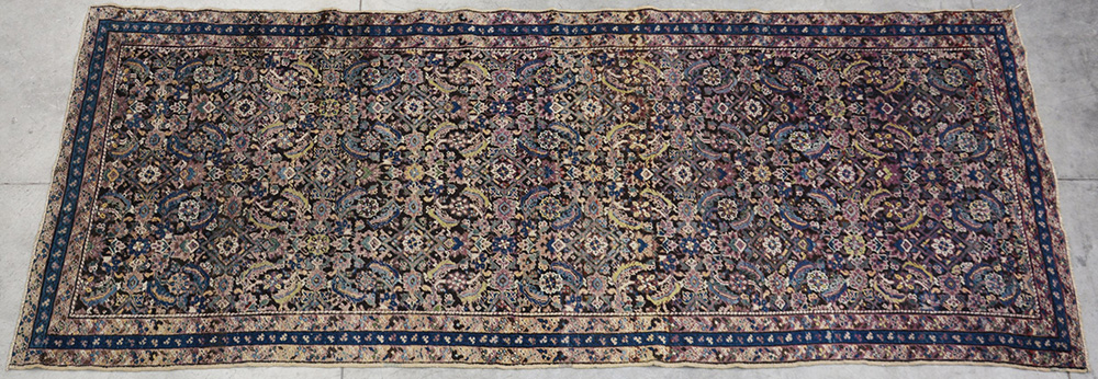 Disegno Herati nei toni del lilla, ciclamino, azzurro, giallo e verde su fondo marrone. (cm 318x138) (difetti)