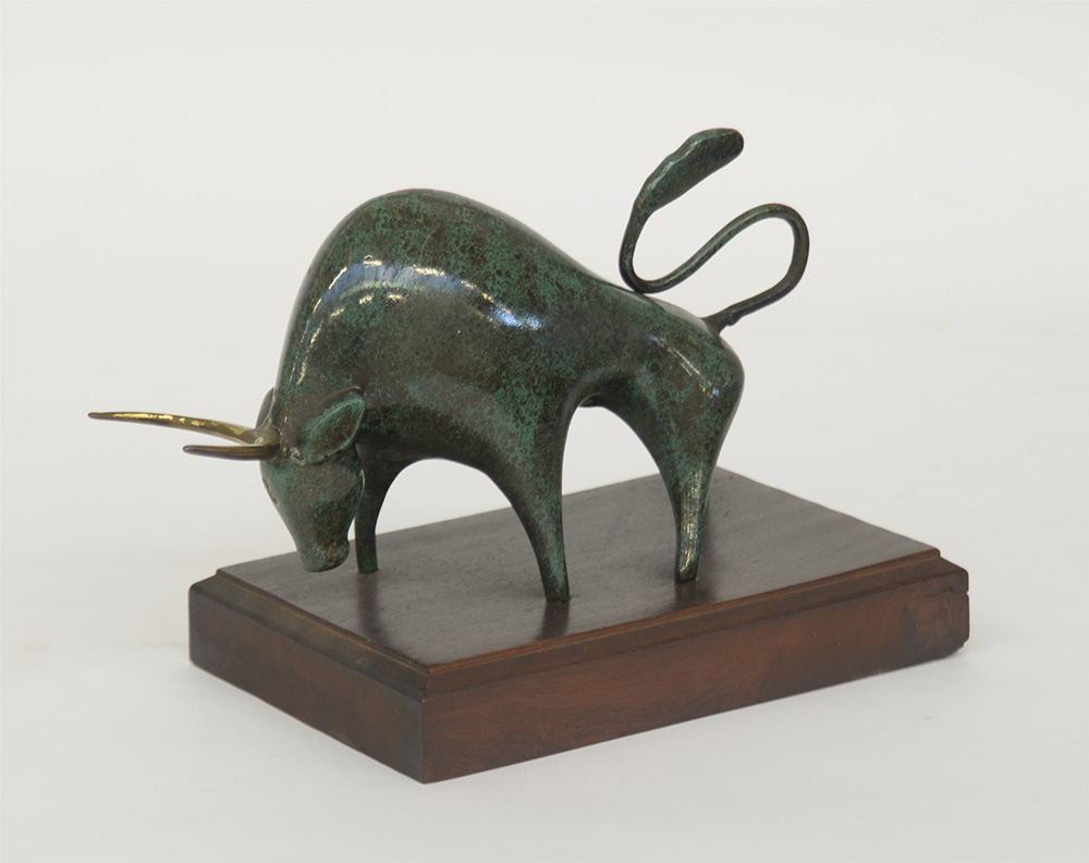 Ignoto "Toro" scultura in bronzo su base in legno (cm 23x21) firmata su una zampa e iscritta sotto la base