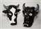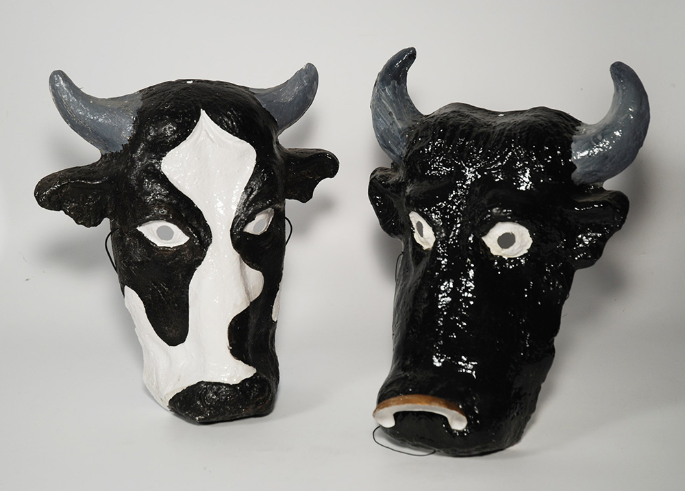 Due maschere di mucca e toro. Multipli in plastica realizzate per la mostra "Mucche e Serafini" alla Galleria Le Bureau des Esprits, Milano, nel 2001. Le maschere venivano date da indossare ai visitatori della mostra. Firmate e numerate I/X e II/X al retro
