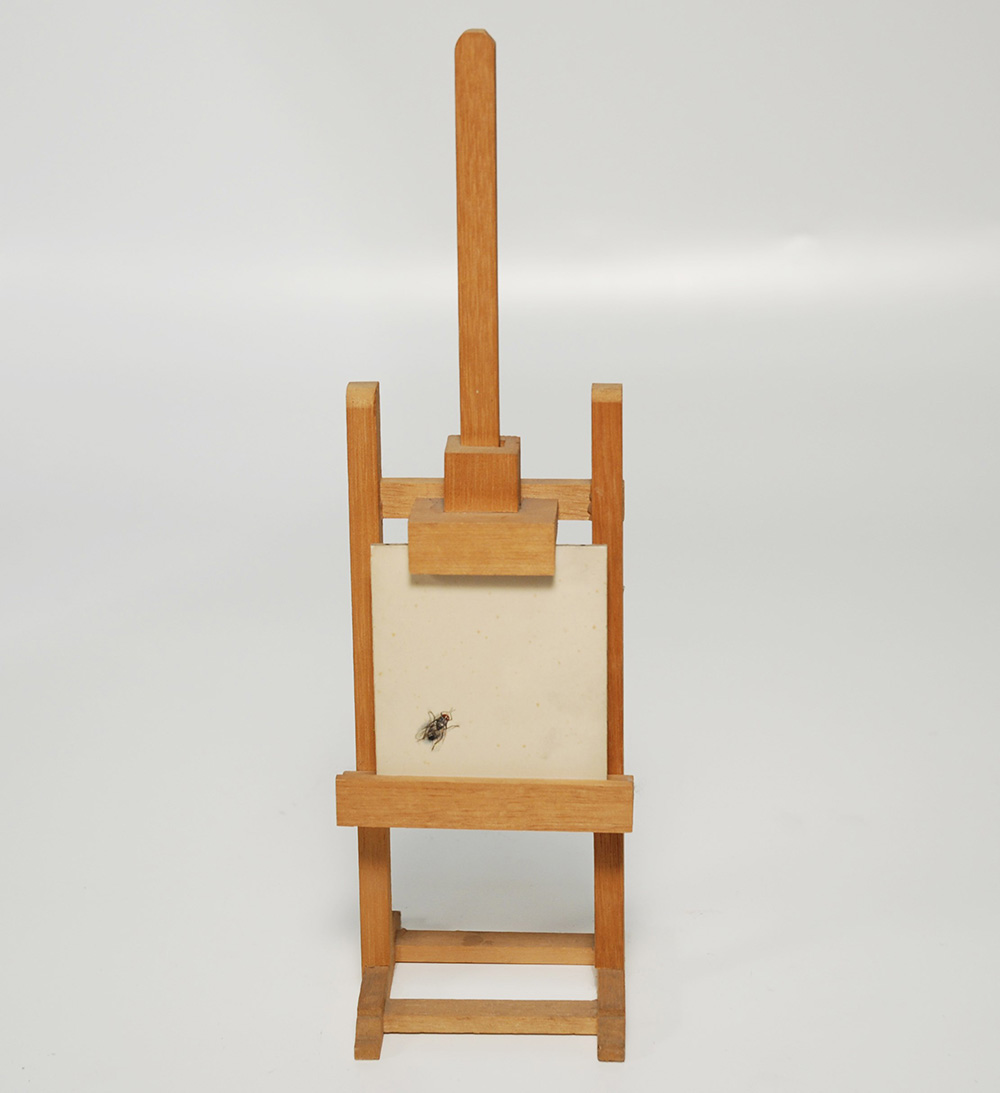 Piccolo dipinto su tavoletta montato su cavalletto in miniatura iscritto e dedicato "Al mio carissimo Giorgio che come il miele attira le mosche"