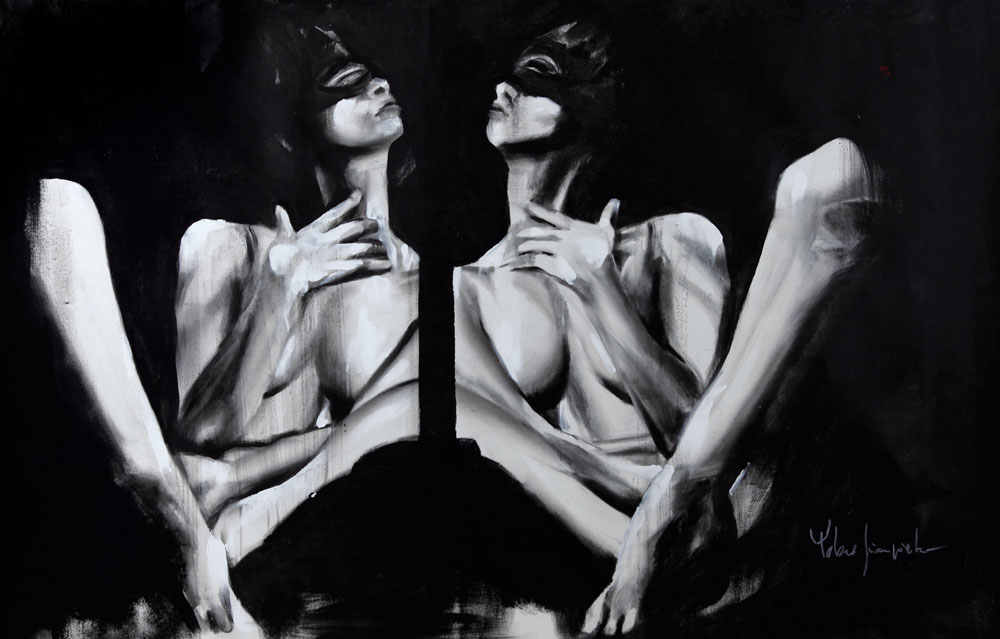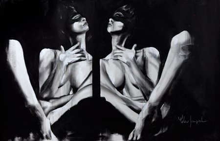 FABIO GIAMPIETRO Milano 1974 - Specchiata, 2002, tecnica mista su tela cm. 150x100, firma in basso a destra, firma, anno ed etichetta della Transit artist Management al retro, opera senza telaio e cornice.