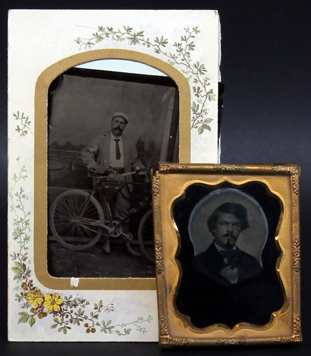 Lotto composto da un ambrotipo (uomo con baffi) e da un ferrotipo (ritratto con bicicletta) metà sec. XIX
