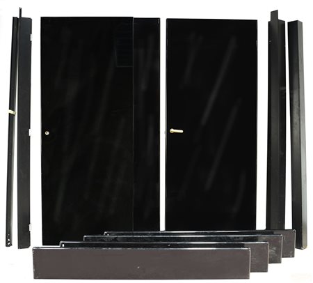 Lotto composto da quattro mensole e tre porte in legno laccato nero complete di maniglie in ottone. Produzione Azucena, Milano, anni 70 (misure varie) (difetti)