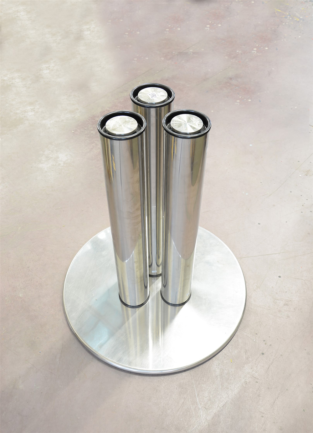 Base di tavolo da salotto modello "Marcuso". Produzione Zanotta, 1971. Tre gambe in tubo di acciaio cromato (h cm 70 ca) (difetti e mancante del piano)