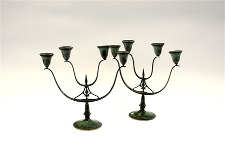 Coppia di candelabri di gusto Novecentoin fusione di bronzo patinato verde. Esecuzione italiana, anni 20 (h cm 33) (lievi difetti)