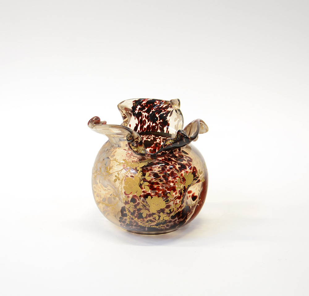 Manifattura di Murano. Vaso a fazzoletto in vetro incolore con inclusioni ametista scuro, rosso opaco, lattimo, azzurro opaco e con decori a rilievo in oro. Sec XX (h cm 16)