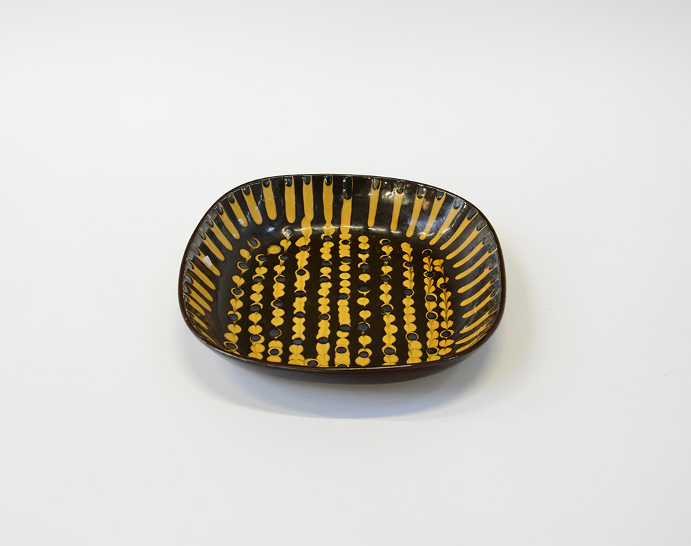 Ciotola svuotatasche in ceramica decorata in giallo su fondo marrone. Anni 60. Marcata "Strode" sotto la base