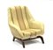 Poltrona imbottita rivestita in tessuto beige con base a slitta in legno di rovere. Italia, fine anni 60 (lievi difetti)