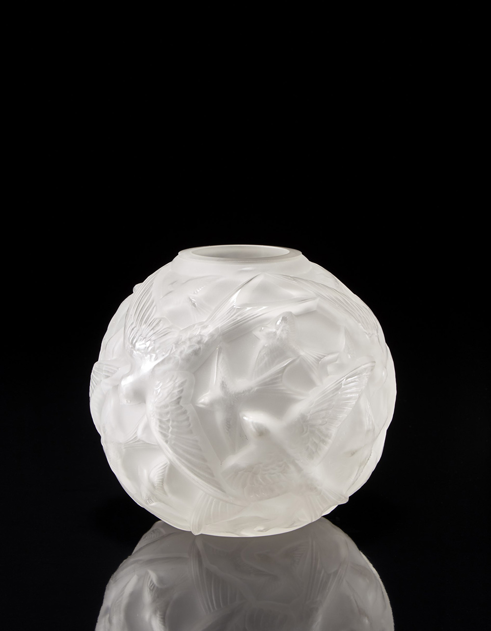 Vaso globulare in vetro incolore patinato soffiato in stampo e molato, decorato in rilievo con rondini. Francia, 1930 ca. (h. cm 18). Firmato a stampo in rilievo "Avesn FRANCE"