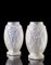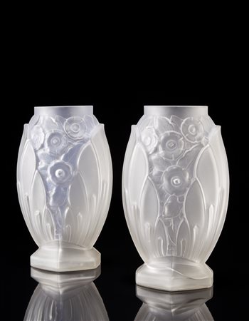 Lotto composto da due vasi in vetro in stampo e satinato decorati in rilievo a foglie e fiori stilizzati, base esagonale (gravi difetti)