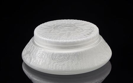 . Scatola con coperchio in vetro soffiato in stampo e satinato con decori geometrizzati di gusto Déco. Inizi del sec. XX (h. cm 6,5 x d. cm 18)