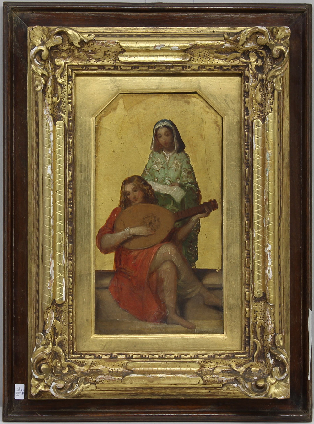Ignoto "Scena romantica rinascimentale" olio su cartoncino (cm 26x14) in cornice