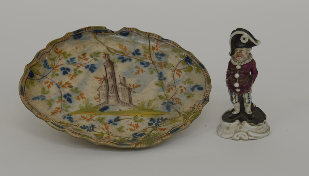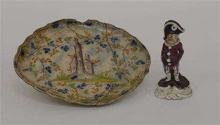 Lotto composto da un'alzatina in maiolica del sec. XVIII e un gruppo in porcellana con figura allegorica del sec. XIX (difetti e restauri)
