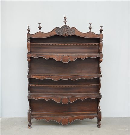 Piattaia in noce di forma sagomata a quattro ripiani montanti a colonna tornita (cm 110x167x28) (difetti)