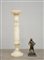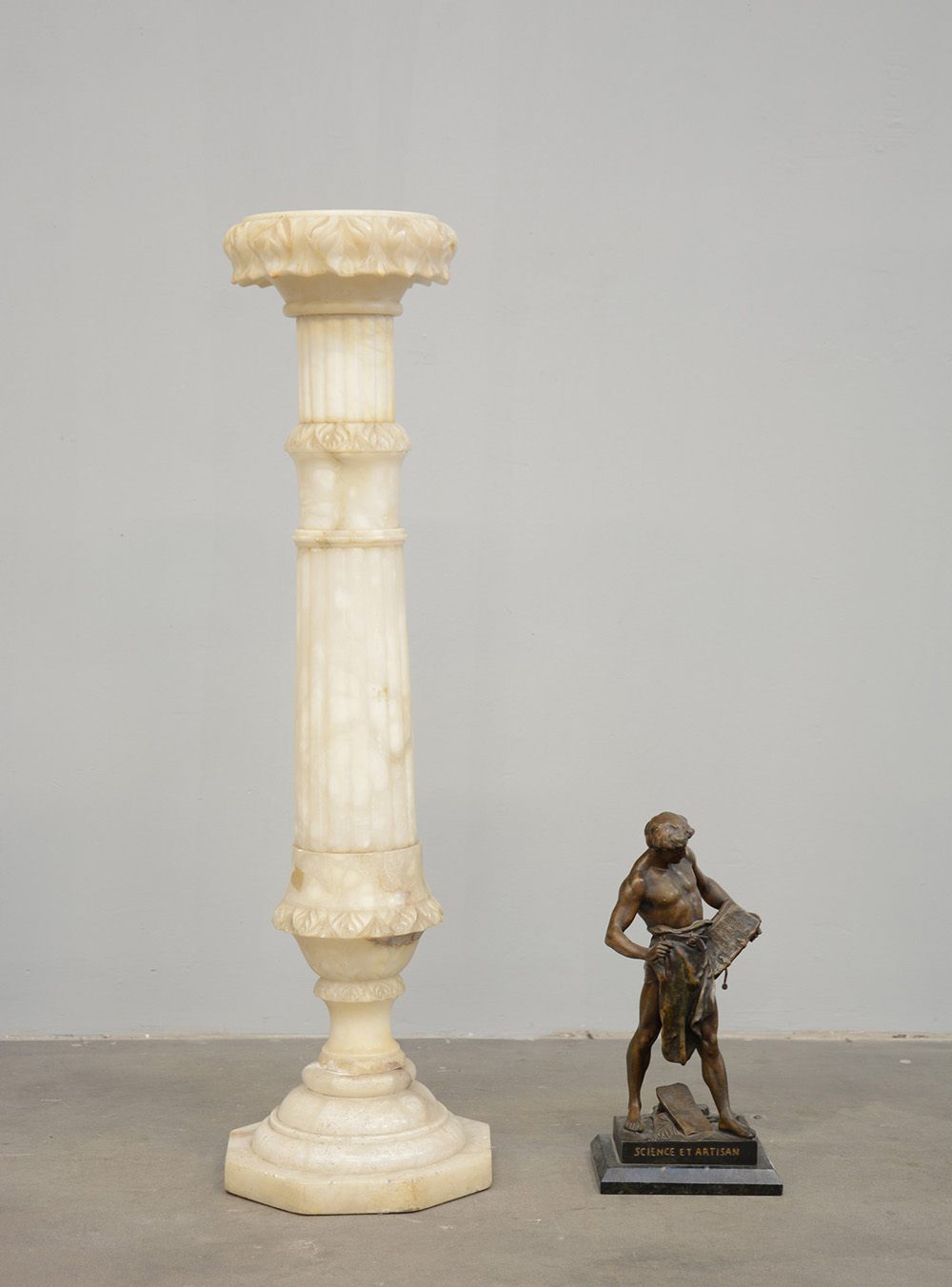 Lotto composto da una colonna in marmo scanalato e scolpito a foglie ed una scultura in metallo raffigurante una figura allegorica su base in marmo (difetti)