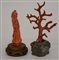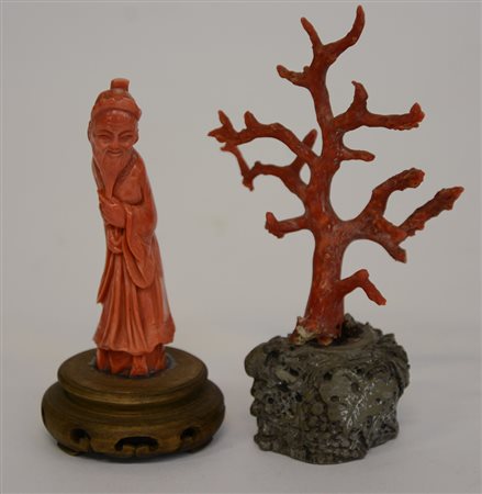 Lotto composto da una scultura di mannifattura cinese in corallo raffigurante un saggio dalla lunga barba con base in legno e un ramo di corallo con base in legno (lievi difetti)