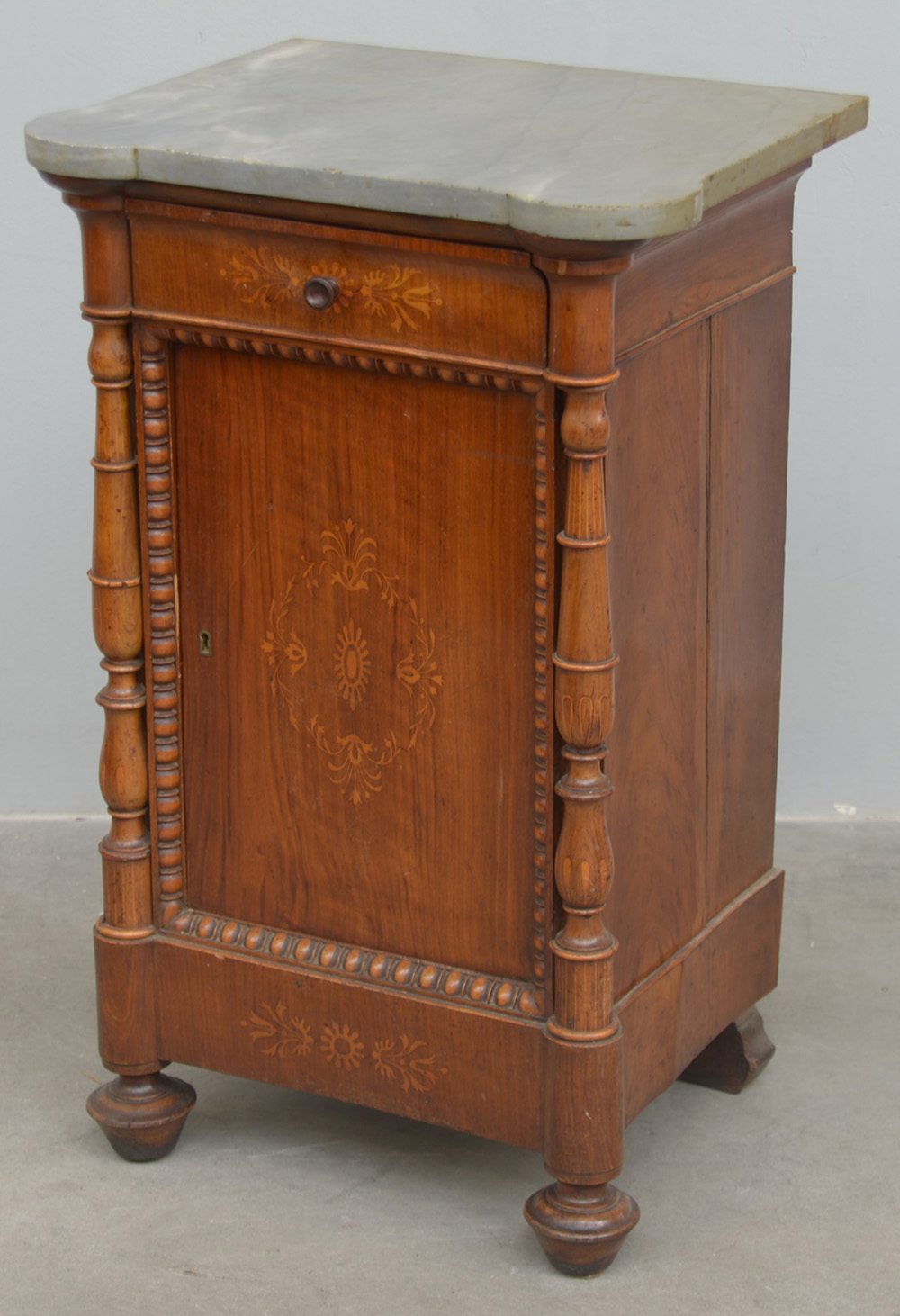 Comodino con fronte ad un'anta e un cassetto intarsiato a motivi vegetali. Montanti torniti. Piano in marmo sagomato. Sec. XIX (cm 52x82x42) (difetti)