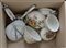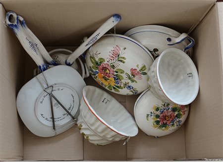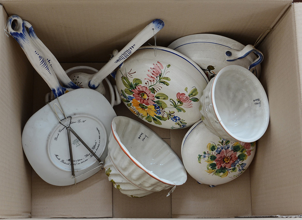 Cartone contenete recipienti e mestoli in ceramica con decoro floreale (difetti)
