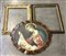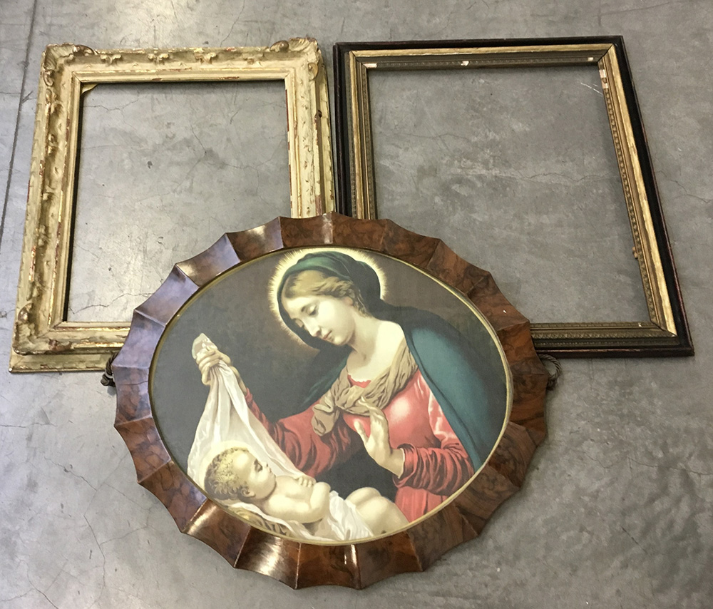 Lotto di tre cornici di fatture e dimensioni differenti di cui una contenente la riproduzione di una Madonna con Bambino (difetti)