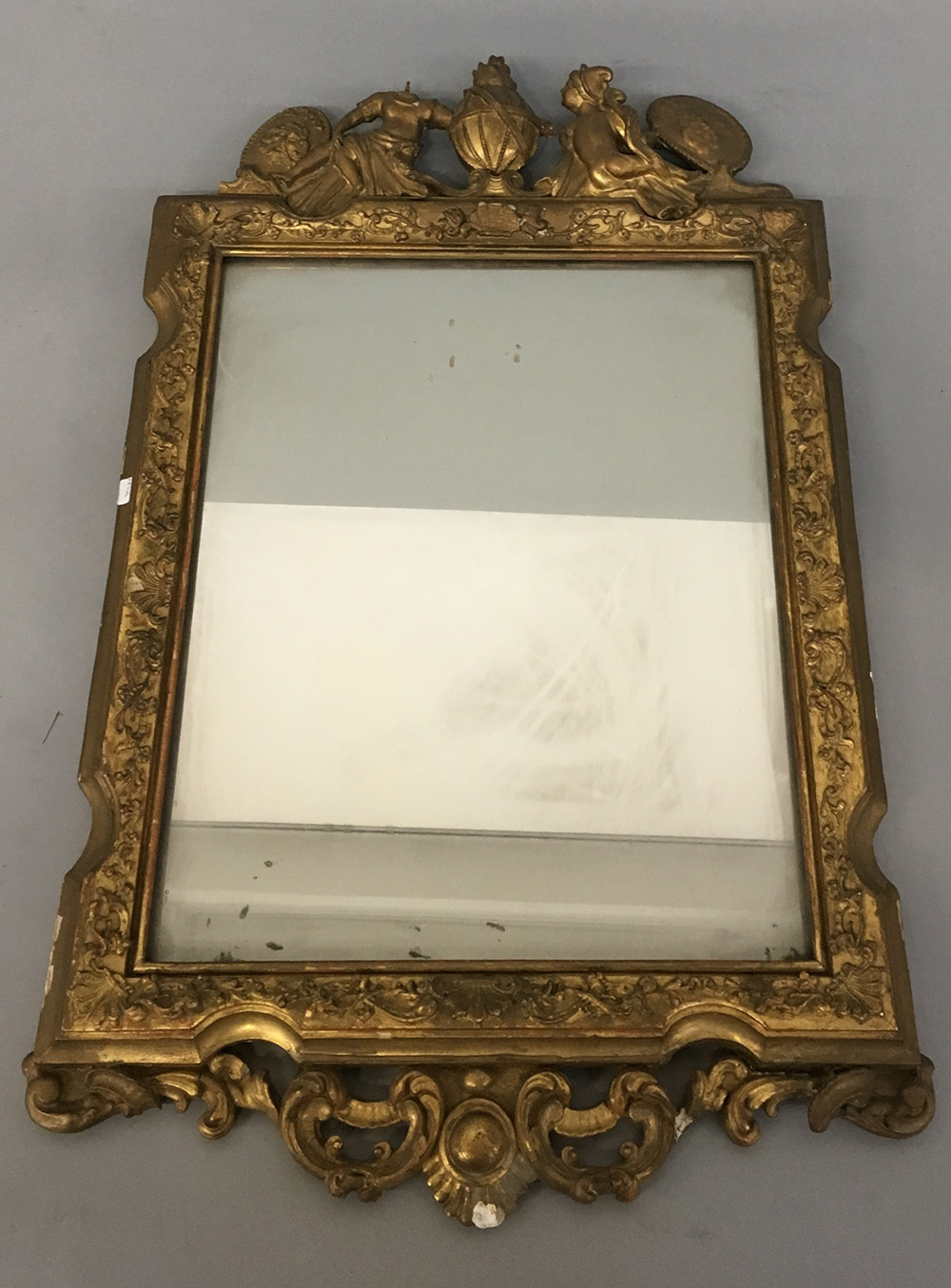 Specchiera con cornice in legno e pastiglia sormontata da figure allegoriche (cm 45x70) (difetti e mancanze)