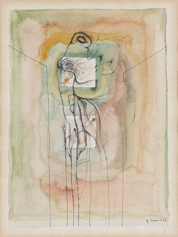 GUIDO BIASI Napoli 05/07/1933 - Parigi (Fra) 09/01/1983 - Senza titolo, 1964, tecnica mista su carta cm. 32x24, firma e anno in basso a destra.