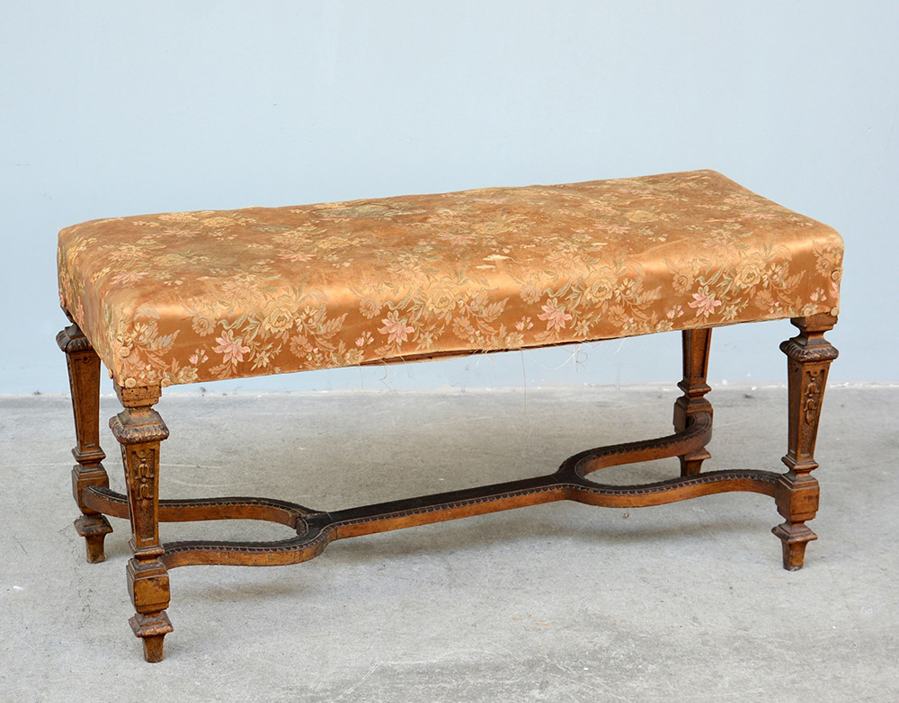 Panchetto con gambe intagliate riunite da traverse, seduta imbottita; sec. XX (cm 100x50x42) (difetti)
