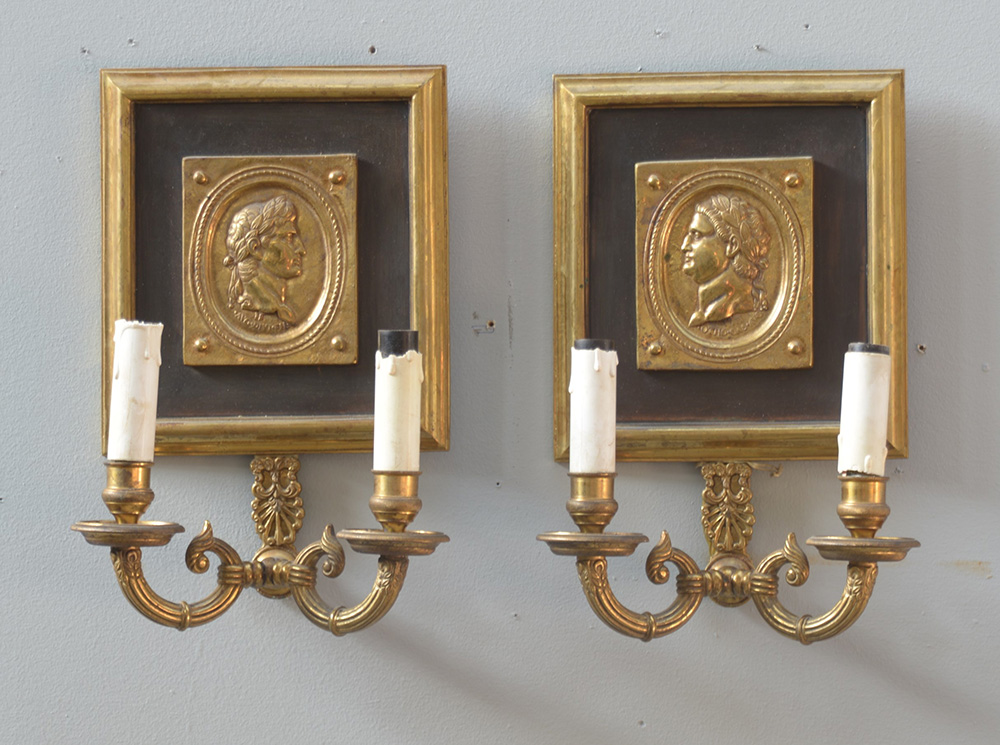 Coppia di appliques in bronzo dorato e cesellato decorate da profili di imperatori romani, fine sec. XIX (h cm 33)(difetti)