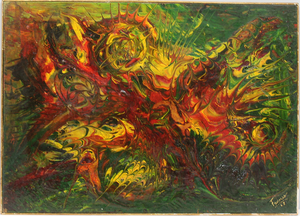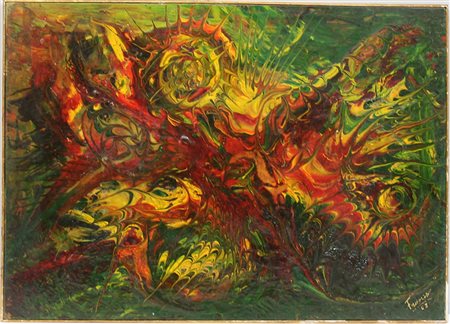 "Composizione" acrilico su compensato (cm 50x70) firmato e datato 1963 in basso a destra, etichette dell'artista al verso (difetti)
