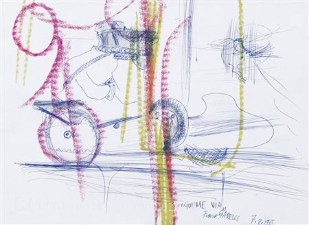 FRANCO GARELLI Diano d'Alba (Cn) 1909 - Torino 1973 - Gomme Via, 1965, pastelli e penna a sfera su carta cm. 24x33,5; firma, titolo e anno in basso a destra.