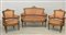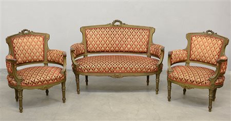 Fornitura da salotto composta da un divano a due posti e due poltroncine a pozzetto, struttura in legno intagliato a foglie e fiori, rivestimento in tessuto operato. Inizio secolo XX (difetti)