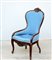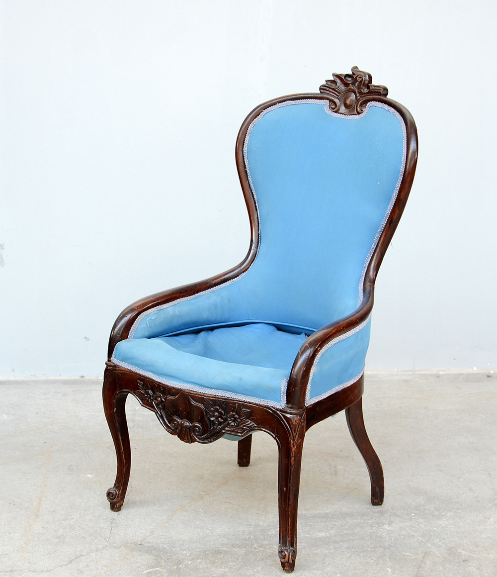 Poltrona in legno tinto con gambe e fascia mossa, schienale a pozzetto e rivestimento in tessuto celeste; fine sec. XIX (difetti)