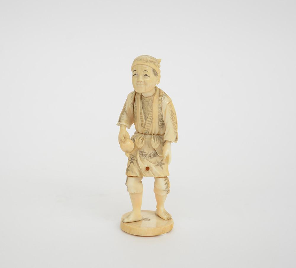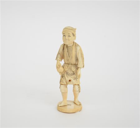Okimono in avorio raffigurante un contadino, firma sul fondo (difetti e mancanze)